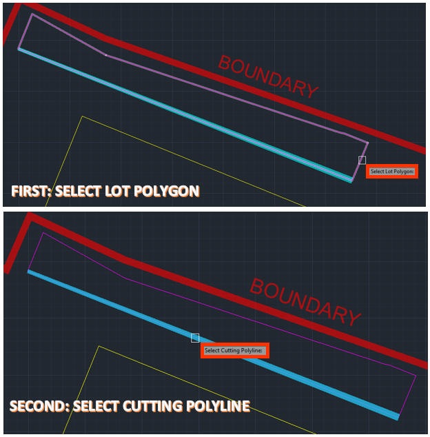 Note: Ensure that the Front Lot Line or Cutting Polyline is already drawn. - Select a lot, then select the already drawn Cutting Polyline.