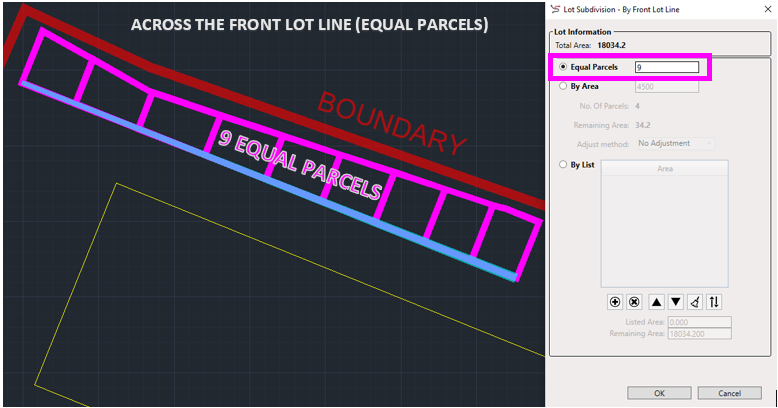 Divides a lot into ‘n’ number of parcels perpendicular to the selected cutting edge (Front Lot Line). Ensure assigning a coordinate system to the drawing. This assignment is crucial for tasks such as area measurement, annotation, and exporting parcels to KML and shapefile.
