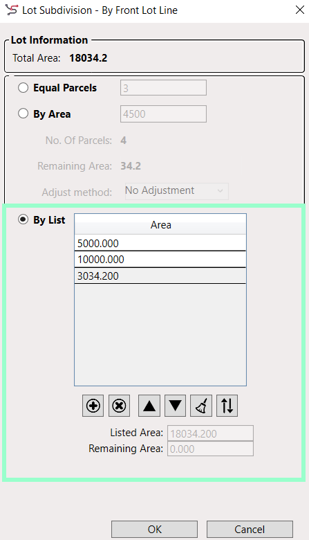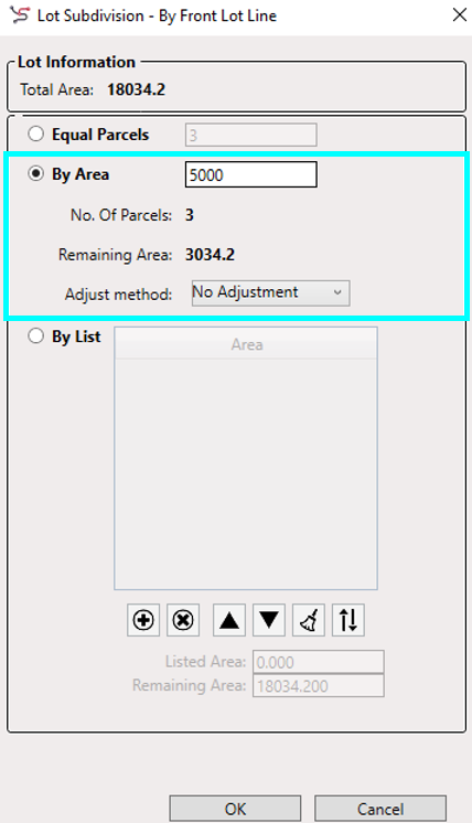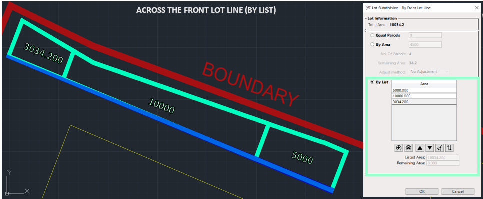 However, upon closer inspection, there is also a 4th parcel. It is indeed a part of the lot, but its area is not 5000; rather, it is 3034.2, representing the remaining area. Since we did not choose an adjustment method, this 4th parcel is displayed separately, following the 3 parcels of 5000.